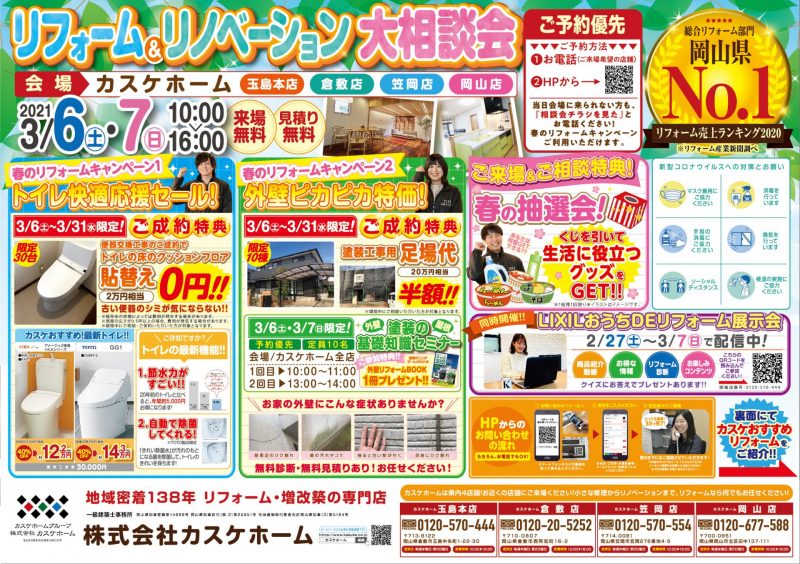 快適リフォーム相談会 折り込みチラシを入れさせていただきました岡山県でリフォームなら売上No1,年間施工実績3,500件以上のカスケホームへ。