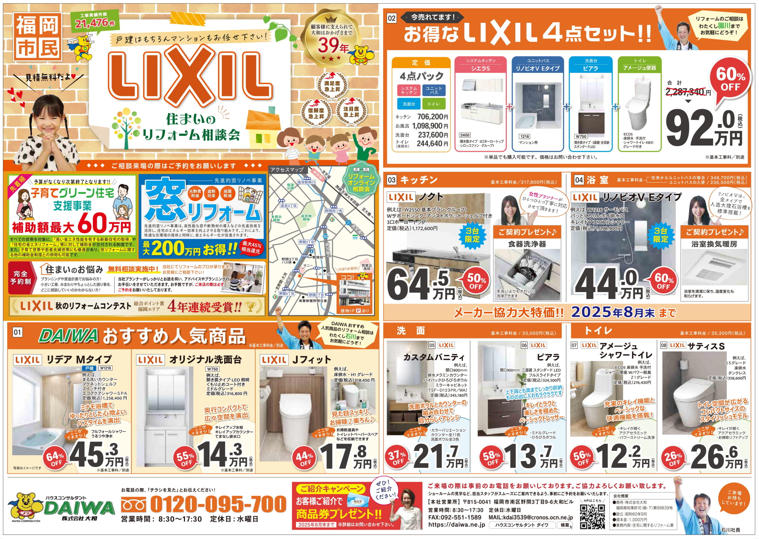 2025年 夏号チラシ LIXIL住まいのリフォーム相談会福岡市南区リフォーム・リノベーション会社 大和 DAIWA費用相談お見積りお任せください。おすすめ事例掲載中。