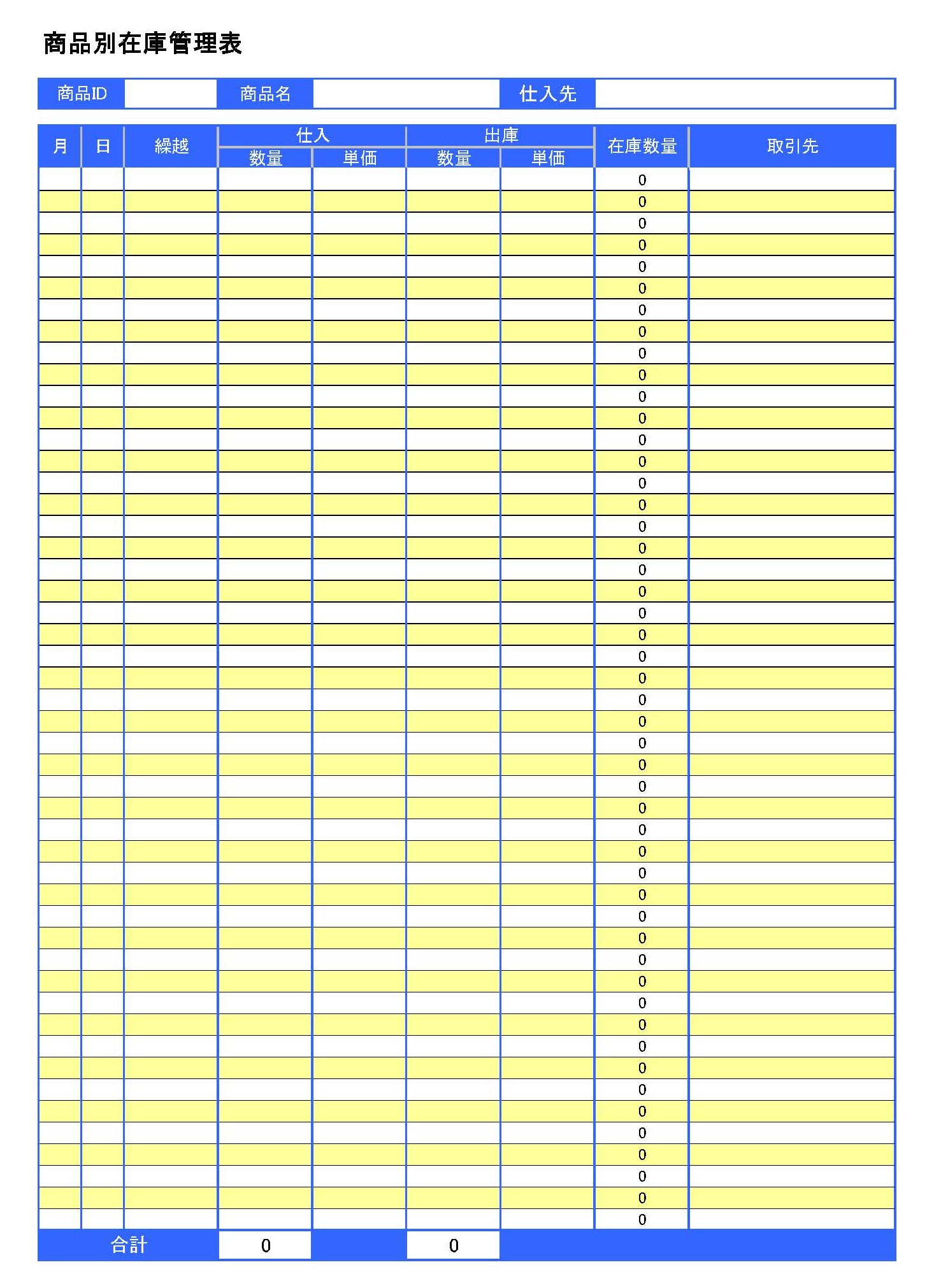 商品別在庫管理表の書式テンプレート Excel・エクセルテンプレート・フリーBiz。