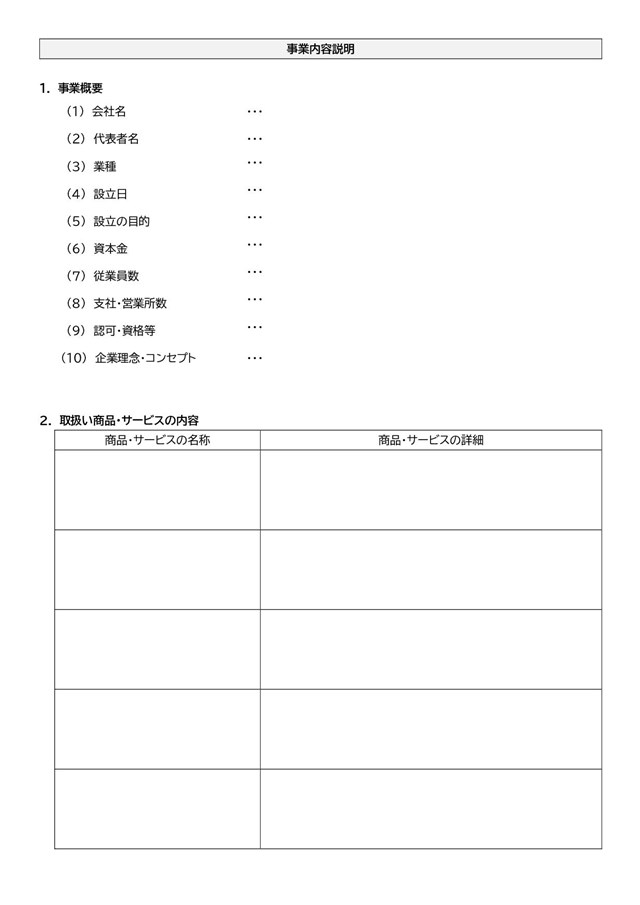 事業内容説明書テンプレート01「概要・取扱い商品の記載」 ワード・Word 無料ダウンロードテンプレートNAVI。