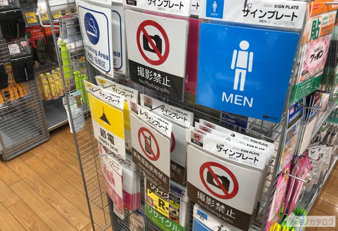 100均ダイソーのサインプレート商品一覧・種類。トイレや撮影禁止などが100円。
