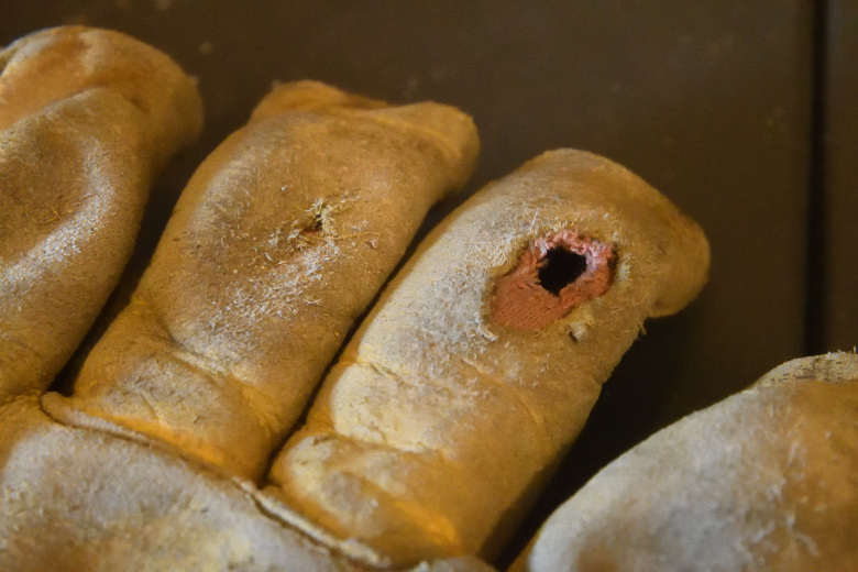 スキーグローブの指先に穴が😩, 中指から小指の3本指を入れる部分に、, 擦れによる革傷みが発生したようです。,同じ風合いの革にて当て縫いさせて頂きました🤗, 腹側一枚だけにミシン縫いせねばならず、, 本体の縫い解き縫い戻しに,結構作業手間が掛かるんですよ😅, ・, ・, ・長居店9:00〜18:00 日曜日は休みです , ・梅田店11:00〜16:00〃,。