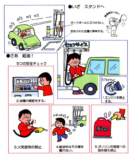 日本のセルフサービス式ガソリンスタンドで給油する方法。