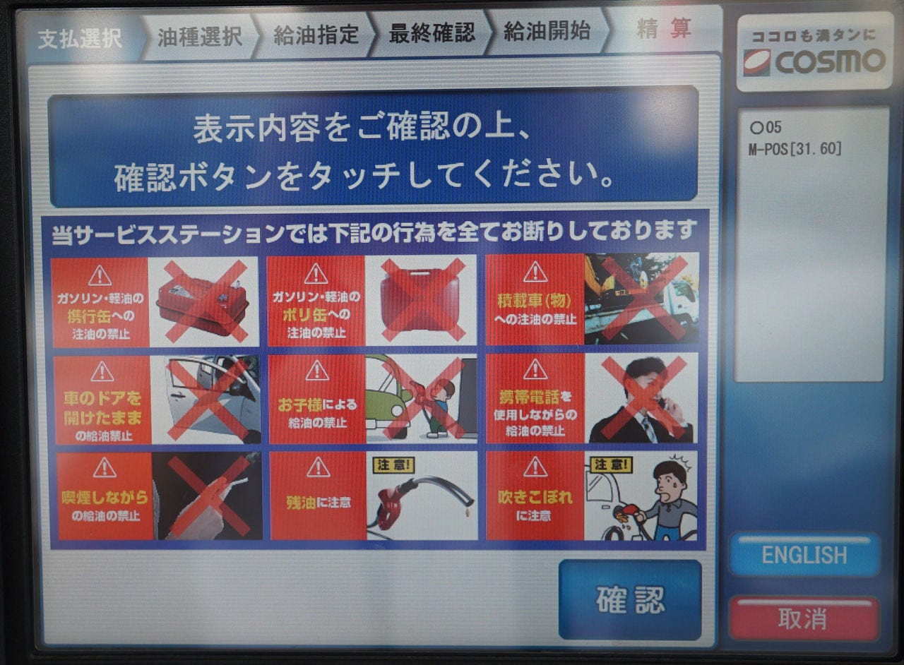 ガソリンスタンドコスモ石油でのキャッシュレスの操作手順。