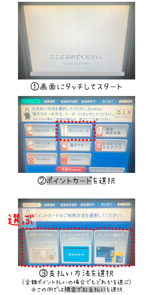 タッチパネル操作解説 ENEOSセルフスタンドでポイント払いする手順朝から昼寝。