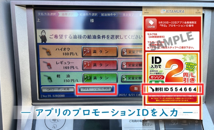 出光先払い式セルフサービスステーションの給油方法。