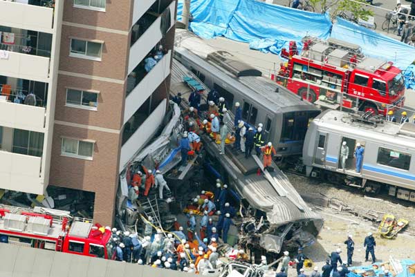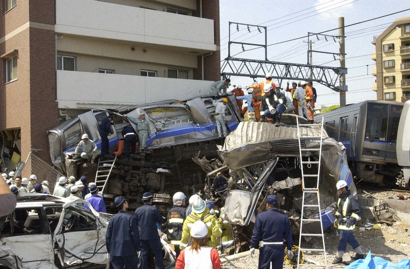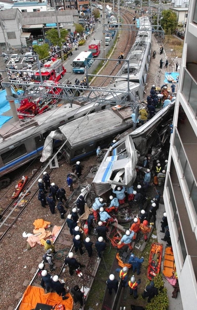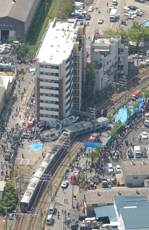 JR福知山線快速電車脱線衝突事故現場で、大 :JR福知山線脱線事故 写真特集:時事ドットコム。