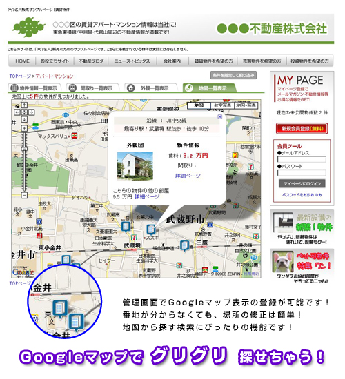 ホームページ管理システム『仲介名人』基本機能 - Googleマップで不動産検索。