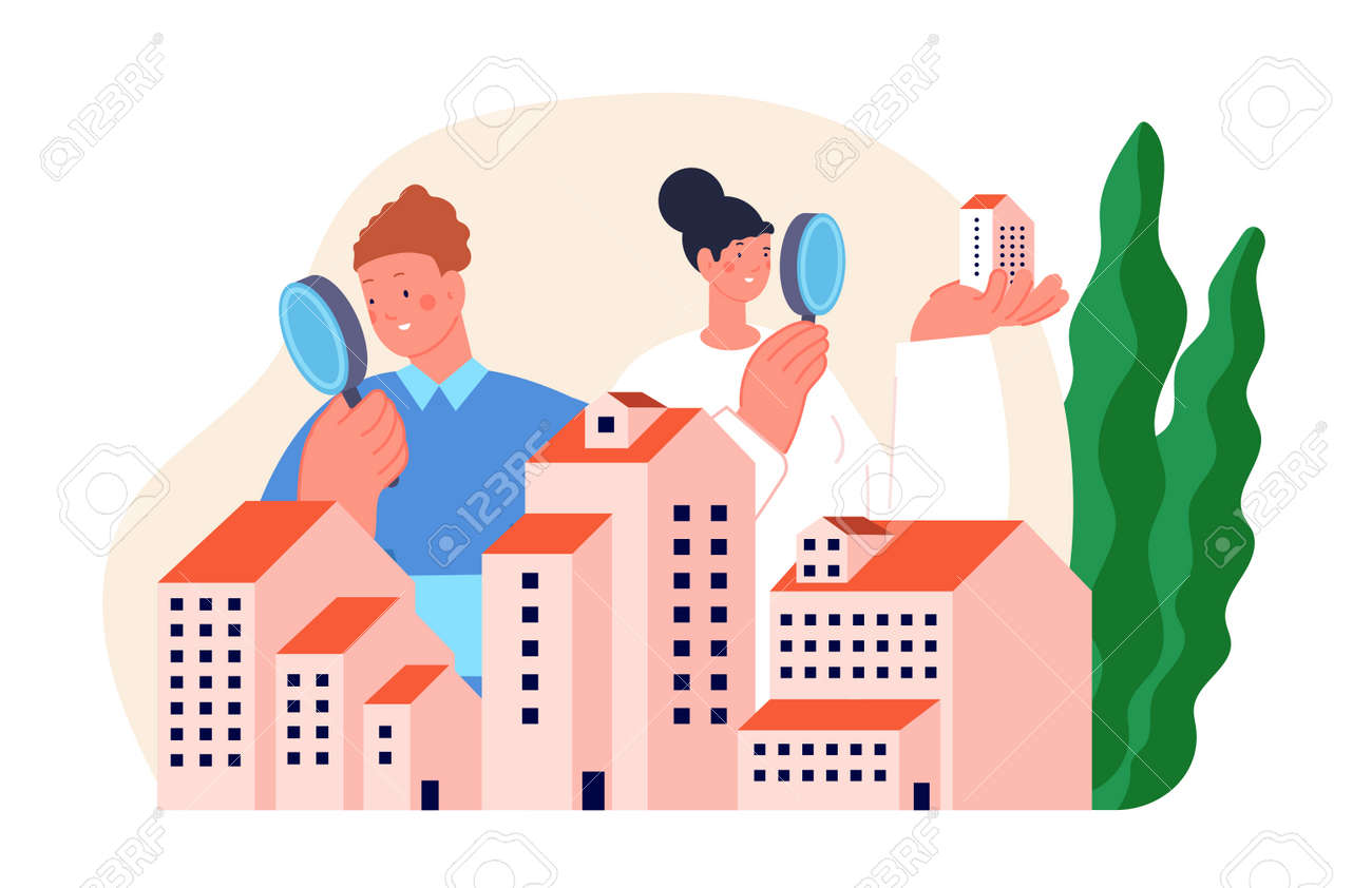 不動産検索。不動産 のコンセプトを購入し、人々は市場で家を探しています。オンラインで家を購入または賃貸し、プロジェクトの完全なベクトルシーンを構築します。イラストハウス物件、マンション 検索のイラスト素材・ベクター Image 172459759。