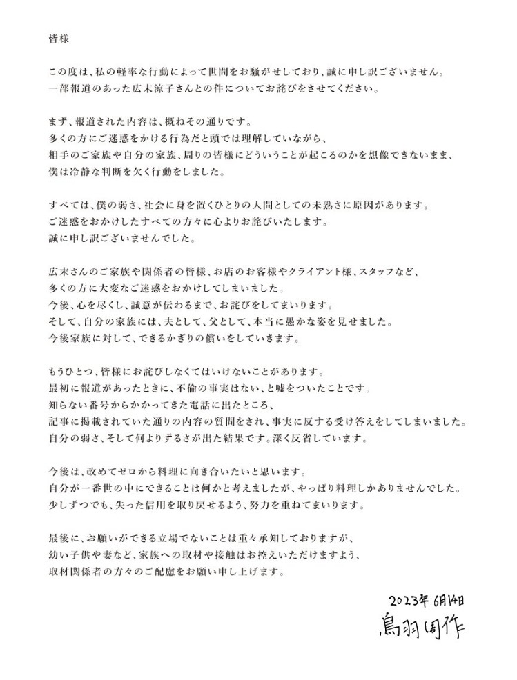鳥羽シェフ“広末涼子と不倫”認め謝罪、嘘ついたことも反省Narinari.com。