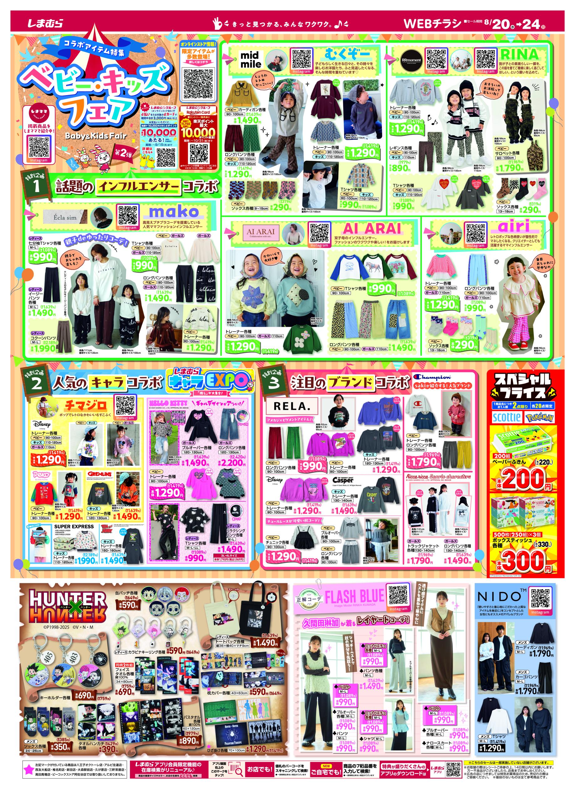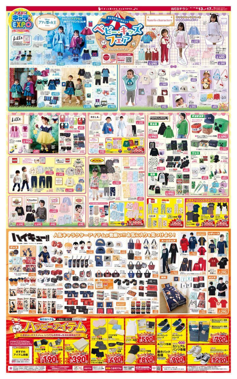 しまむらチラシ 速報2025年10月1日~スヌーピー、ポケモンの秋冬アイテム!ディズニー、サンリオ、クレヨンしんちゃん、カービィのソックス+ポーチのハッピーバッグも!ベビー・キッズフェア冬が開催。