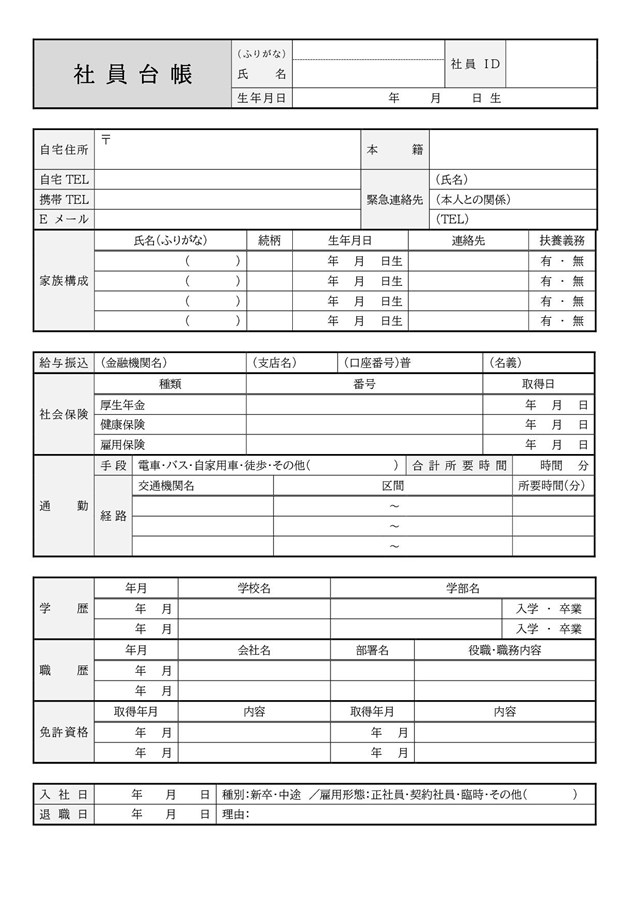 社員台帳テンプレート03「給与振込口座・通勤経路記入欄付き」 ワード・Word 無料ダウンロードテンプレートNAVI。