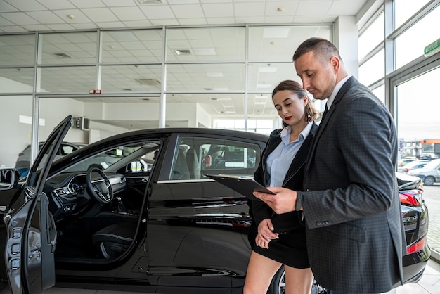 女性の自動車ディーラーがフォームに記入し、ショールームで車を販売していますPremium写真。
