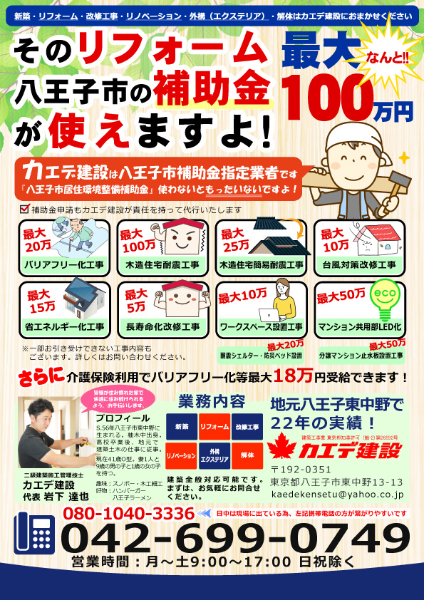 八王子市の建設補助金指定業者、カエデ建設様 チラシ多摩市 ホームページ制作 株式会社HTP。