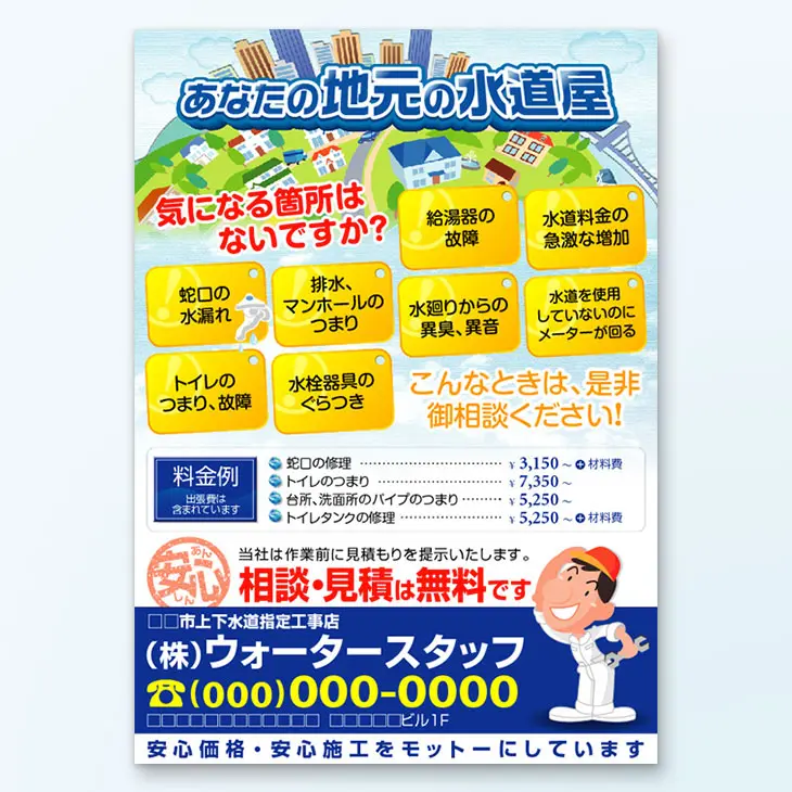 水道工事メニューチラシデザイン事例サービス紹介、料金紹介、親しみやすいデザインチラシ作成専門 デザイン+印刷のCHIRASAKU チラサク。