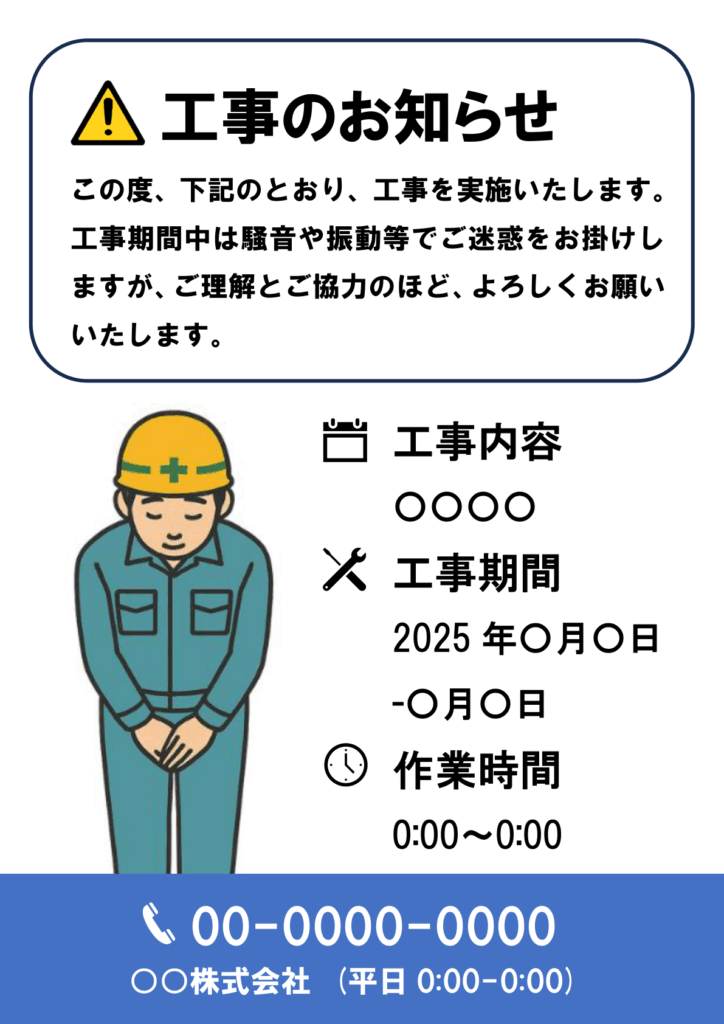 工事のお知らせの張り紙例文とイラスト入り無料テンプレートのダウンロード - 登録不要のフリーテンプレート。