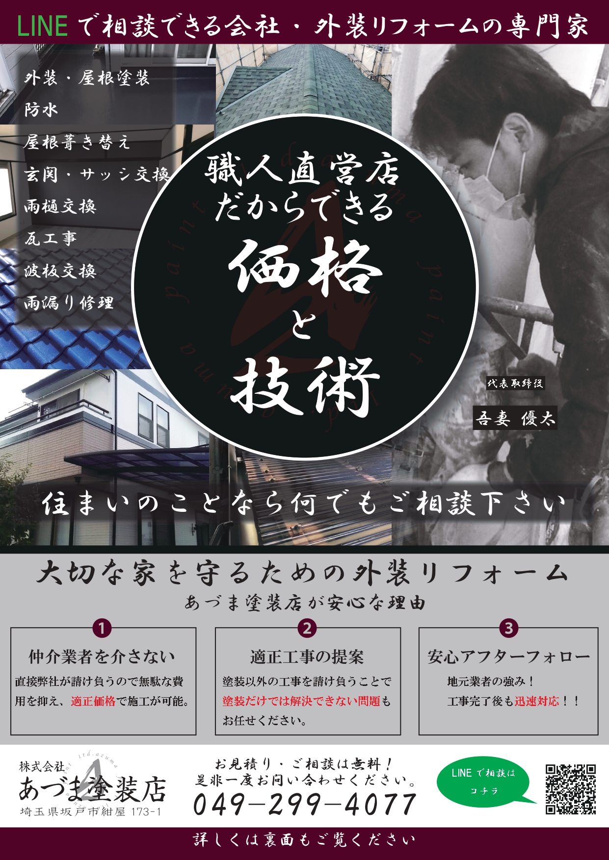 塗装会社A4片面カラーチラシデザイン事例料金紹介、事例掲載、スタッフ写真を掲載し信頼感を得るチラシ 作成専門 デザイン+印刷のCHIRASAKU チラサク。