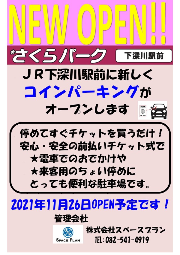 開店情報 JR芸備線の下深川駅前にチケット式のコインパーキング「さくらパーク下深川駅前」がオープンしたみたい。まるごとGO!この町の情熱を熱くする地元メディア。
