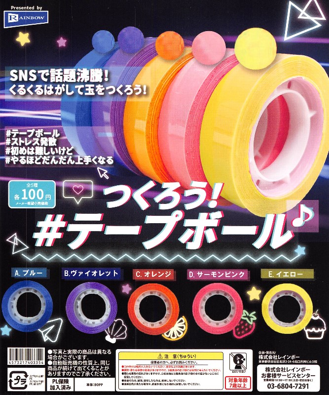 原産国:中国 材質:本体:合成ゴム系粘着剤 商品サイズ:8.7cm ×4cm ×8.7cm 内容量:1個入種類:ピンク、パープル、オレンジ、グリーン、イエロー、ブルー 色んな色のテープで くるくるまいてボールを作ろう!○写真はイメージです。対象年齢15歳以上 全6色 サイズ。