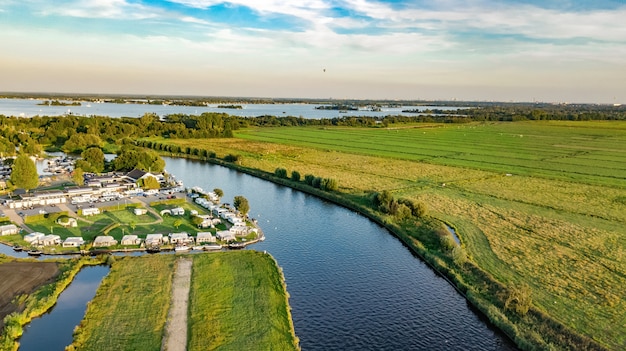 運河、干拓地の水、緑の野原、オランダ、オランダの上から農家の典型的なオランダの風景の空中ドローンビューPremium写真。