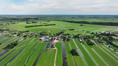 夏の典型的なオランダの干拓地、運河または溝と緑の牧草地、Ransdorpの教会の塔の上からの概要、アムステルダム、北オランダ、オランダの自治体の小さな村の部分。写真素材2329971353Shutterstock。