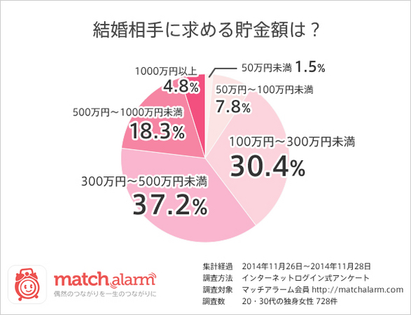 結婚相手に求める「貯金額」、独身女性の6割が「300万円以上」と回答マッチアラーム株式会社のプレスリリース。