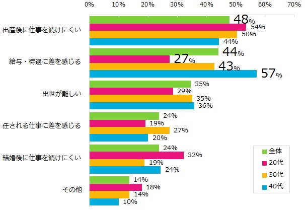 女性は不利だと職場で感じたことがある女性は54%! 理由は「出産後のしごと」「給与・待遇の差」 女性の職場環境調査 ~「働きやすい職場」を発表~エン株式会社のプレスリリース。