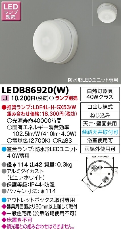 ※LEDランプ別売※ LED照明器具 LED浴室灯 一般住宅用 コンパクト 白熱灯器具40Wクラス 浴室使用可能 東芝ライテック 天井・壁面兼用雨線内使用可 端子台付 ねじ付属 ホワイト 乳白 LED電球対応 E17 LEDB88920eでんでん楽天市場店。