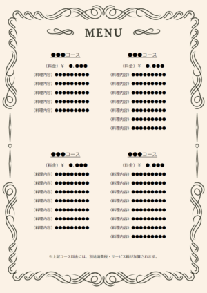 レストランのメニュー表のテンプレート Word・ワード使いやすい無料の書式雛形テンプレート。