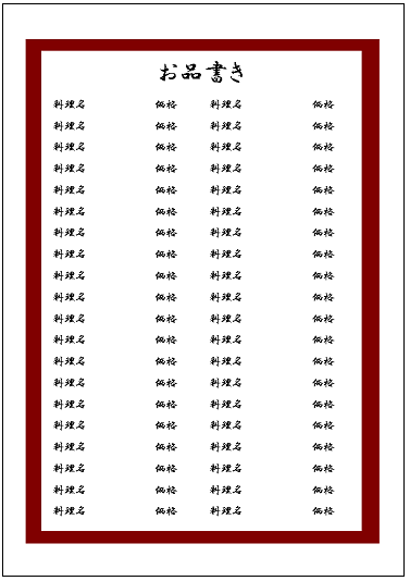 お品書きテンプレート - Excelフリーソフト館 - 無料テンプレート集。