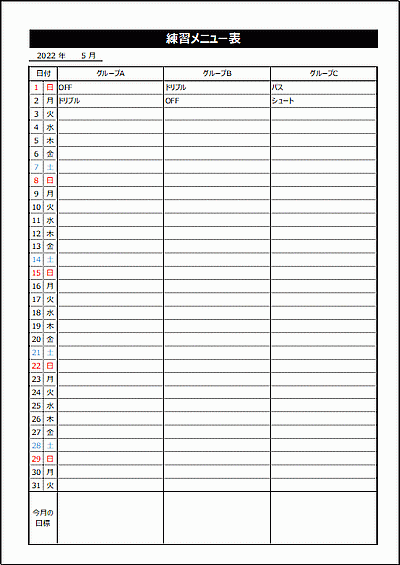 練習メニュー表テンプレート - Excelフリーソフト館 - 無料テンプレート集。