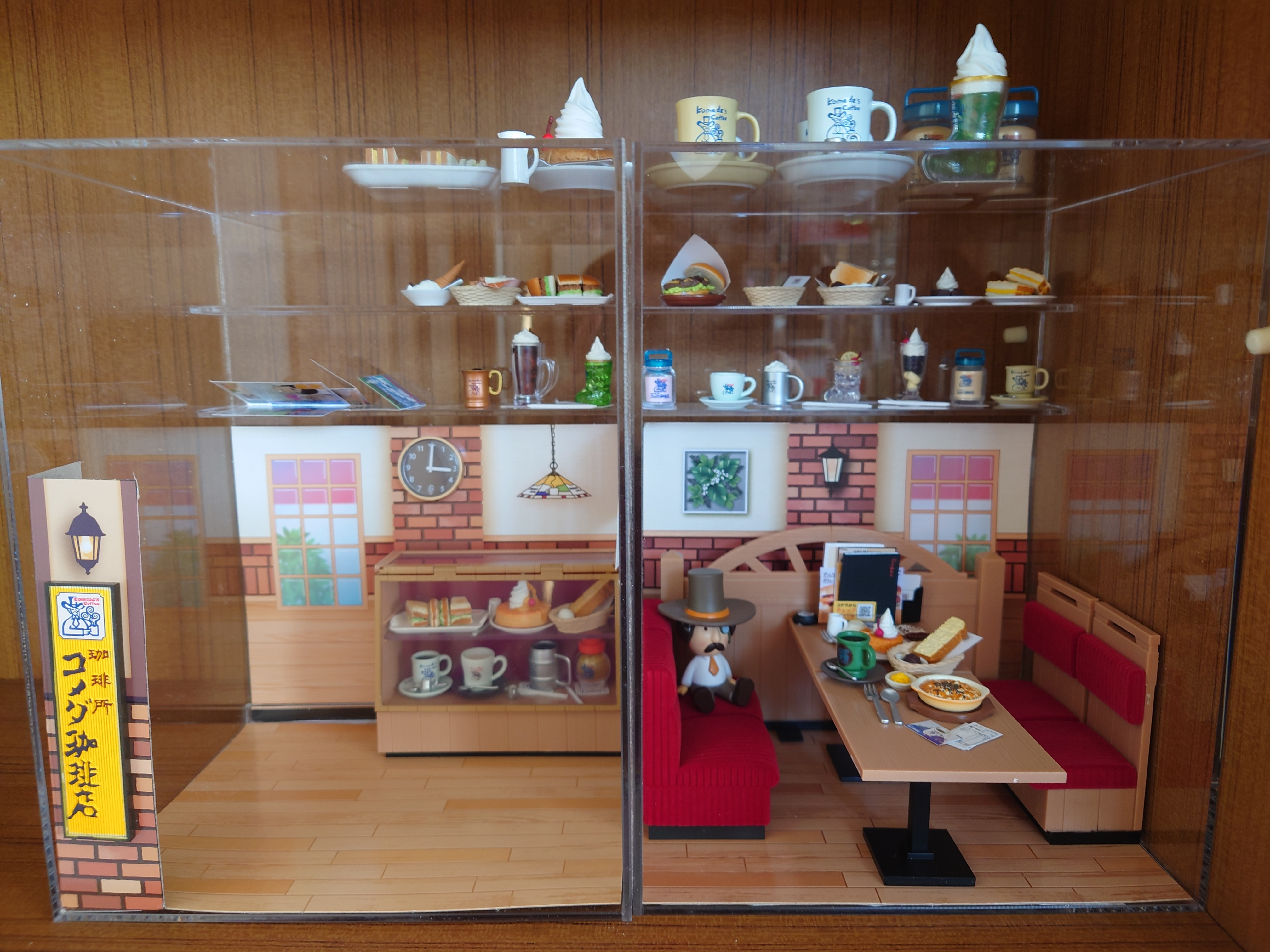 リーメントのコメダ珈琲店 第1弾と第2弾を一緒に飾ってみました☕️ 凄いよね、このクオリティ。自宅にコメダ珈琲店があるってさ😂このケースはリーメント2セット分入れると、良い分量で詰め込める気がしてて。 やっぱり丁度よく良い感じに収まりました😌 背面ボードは。
