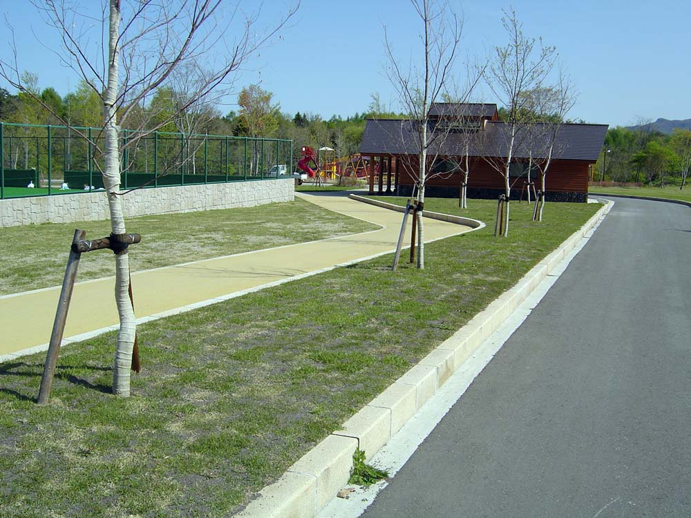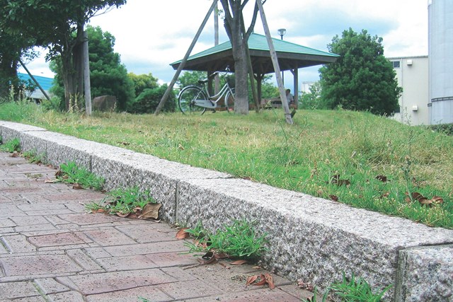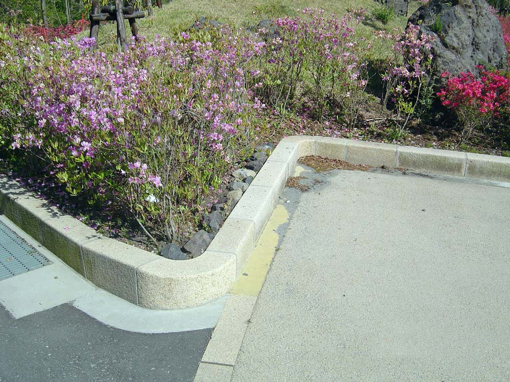 公園 御影石 施工例 歩車道境界縁石・歩車道境界身障者乗り入れ・車止め軽井沢町 湯川ふるさと公園アスザック株式会社インフラエンジニアリング事業部。