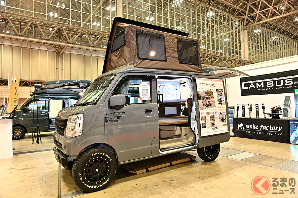 スズキ「"車中泊"軽バン」カスタムに反響多数! 新発想の「横開きルーフ」に「スゴい!」「これなら寝られそう」と驚きの声も!「エブリイ」キャンパー「スマイルファクトリー オフタイムBASE」に集まる"熱視線"とはくるまのニュース。