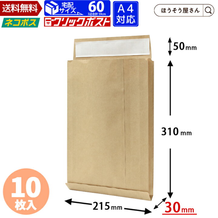 楽天市場10日限定☆ポイント7倍小分け販売 ネコポス 3cm 宅配袋 無地 薄マチ発送袋 10枚入り らくらくメルカリ便 ゆうパケット 日本製紙袋 箱 マチ付封筒 配送袋 宅配袋 フリマ オークション ポスト投函 クリックポスト 梱包 : ほうそう屋さん。