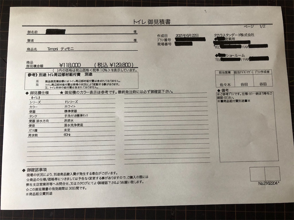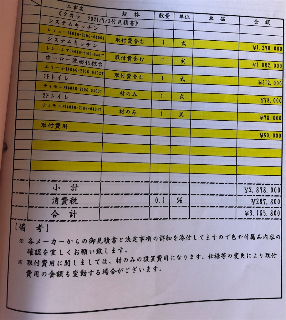 タカラスタンダードの見積もりがきたよひじりのおうち。