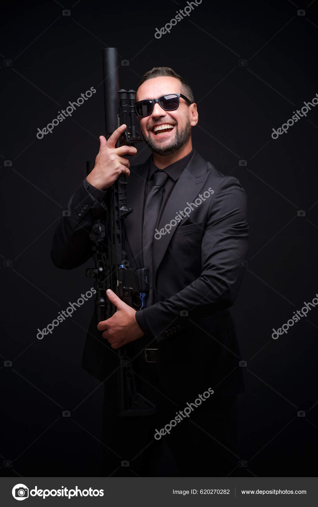 黒のスーツとサングラスでライフルの男と恋に落ちる アサルトライフルを持ってる 黒のスーツのシークレットサービスマンボディガードや特殊部隊の男と銃黒の背景に隔離された— ストック写真 © NoMoreStock620270282。