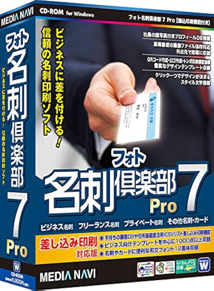 Amazon.co.jp:上位版 名刺作成 ビジネス プライベート 会員証 社員プロフィール管理 各種名刺用紙対応 プリンター 宛名印刷メディアナビ フォト名刺倶楽部7 Pro差込印刷機能付き: PCソフト。