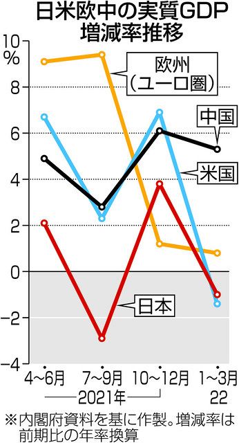 1~3月期GDP、4四半期ぶりマイナス成長 物価高「再加速」で個人消費が伸び悩み : 読売新聞。