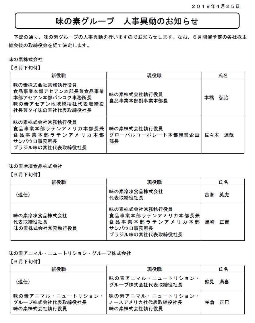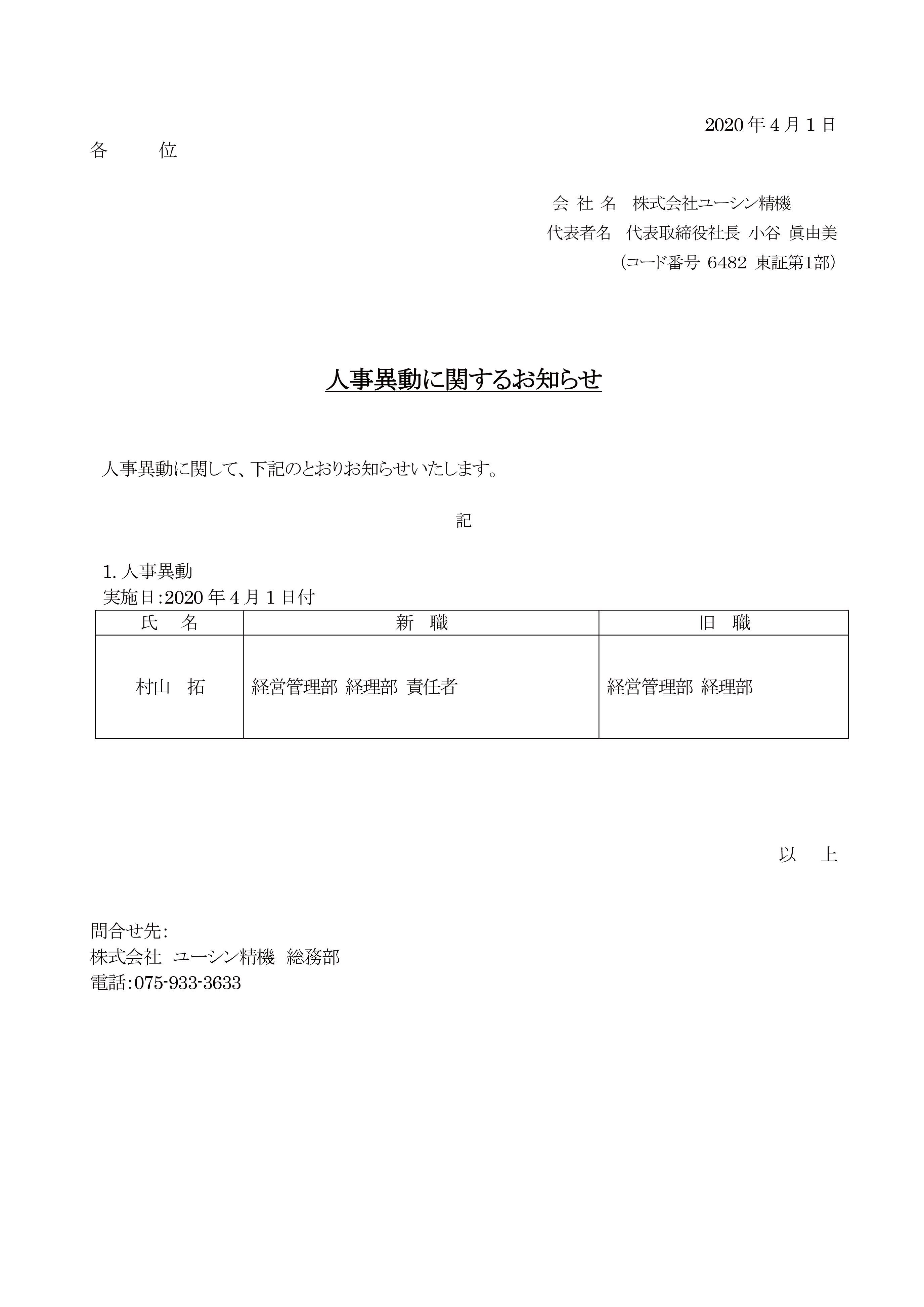人事異動に関するお知らせニュースリリースYUSHIN株式会社。