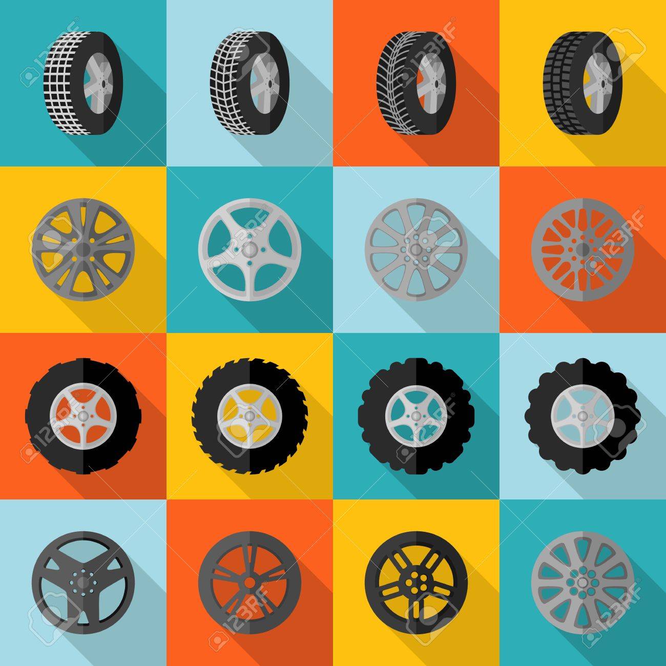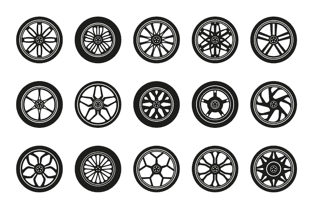 車のタイヤのアイコン。さまざまな角度のタイヤホイール。Premiumベクトル素材。