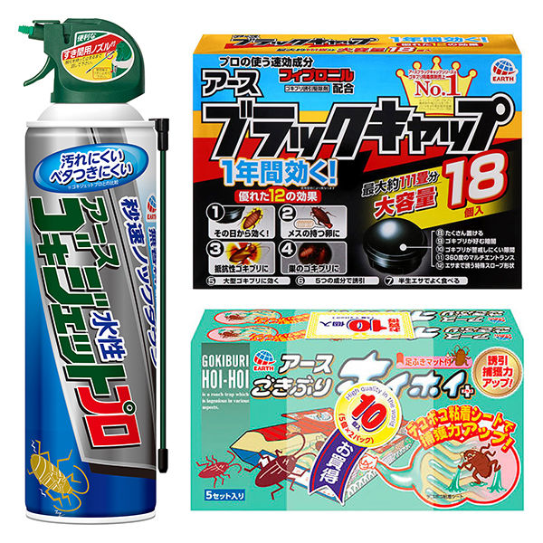 ゴキブリ対策セット水性ゴキジェットプロ1本&ブラックキャップ1箱&ごきぶりホイホイプラス1パックゴキブリ 駆除 殺虫剤 アース製薬 1セット- アスクル。