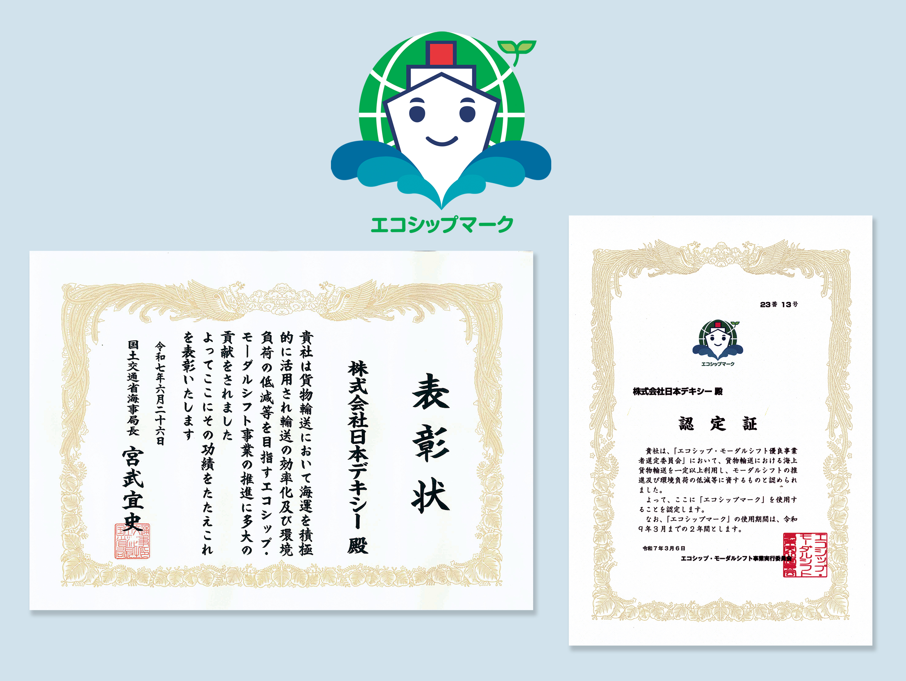 令和6年度エコシップ・モーダルシフト優良事業者国土交通省海事局長表彰受賞のお知らせ ニュースリリース株式会社日本デキシ。
