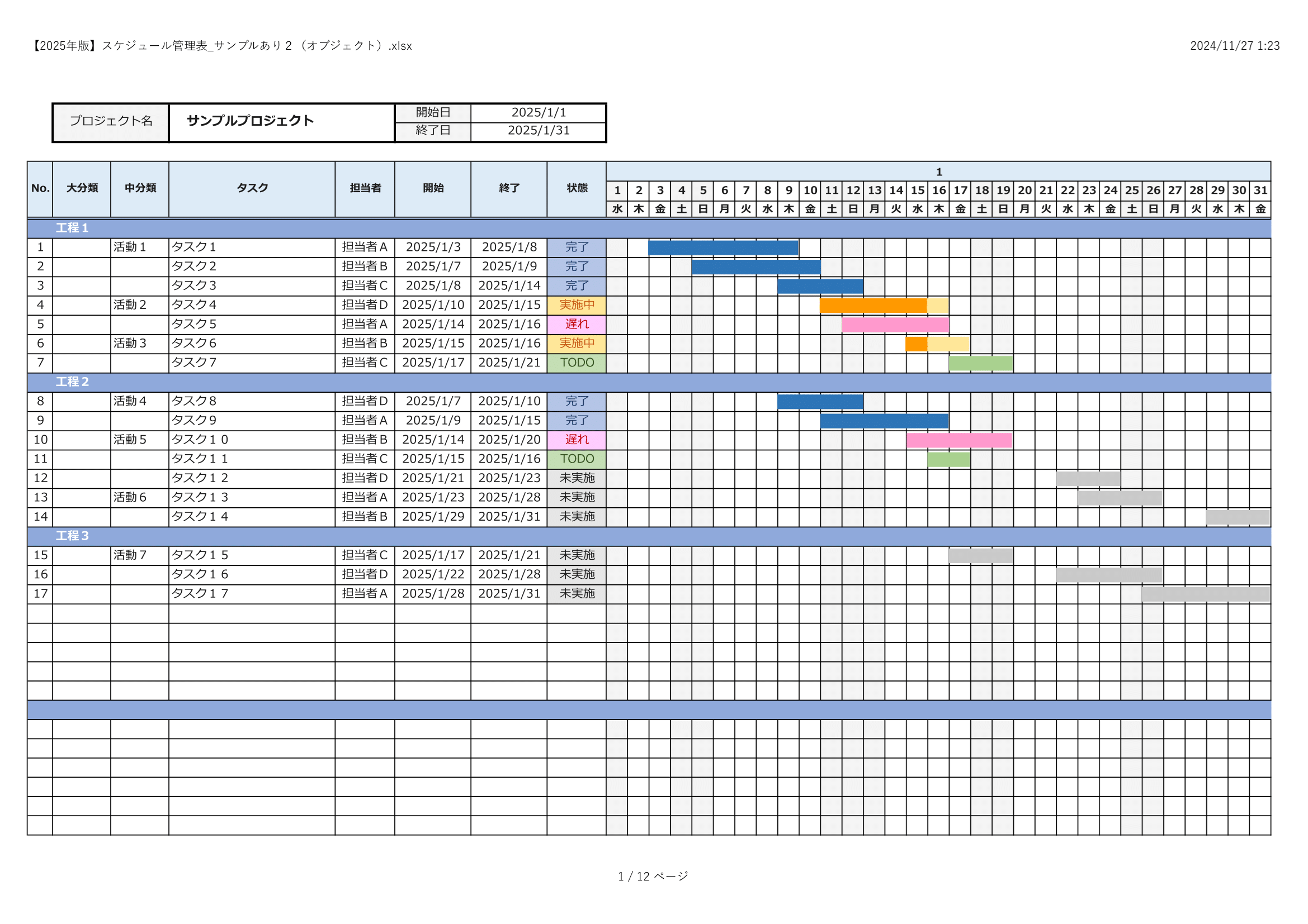 2025年版ガントチャート無料Excelテンプレートスケジュール管理・入力補助・フィルター付き・サンプル、入力補助付きですぐに作成開始できる -BIZ-NEXTテンプレート。