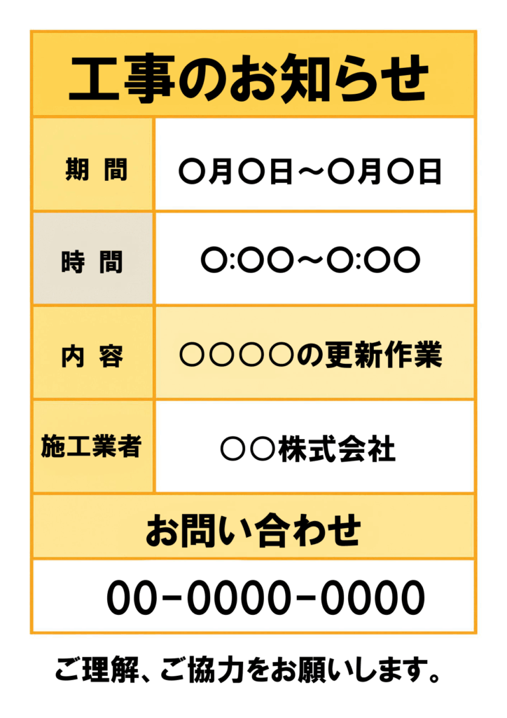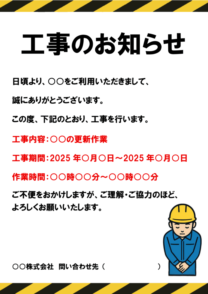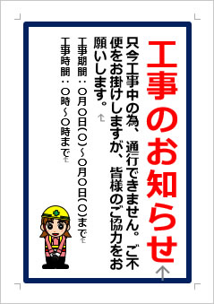 工事のお知らせの張り紙例文とイラスト入り無料テンプレートのダウンロード - 登録不要のフリーテンプレート。