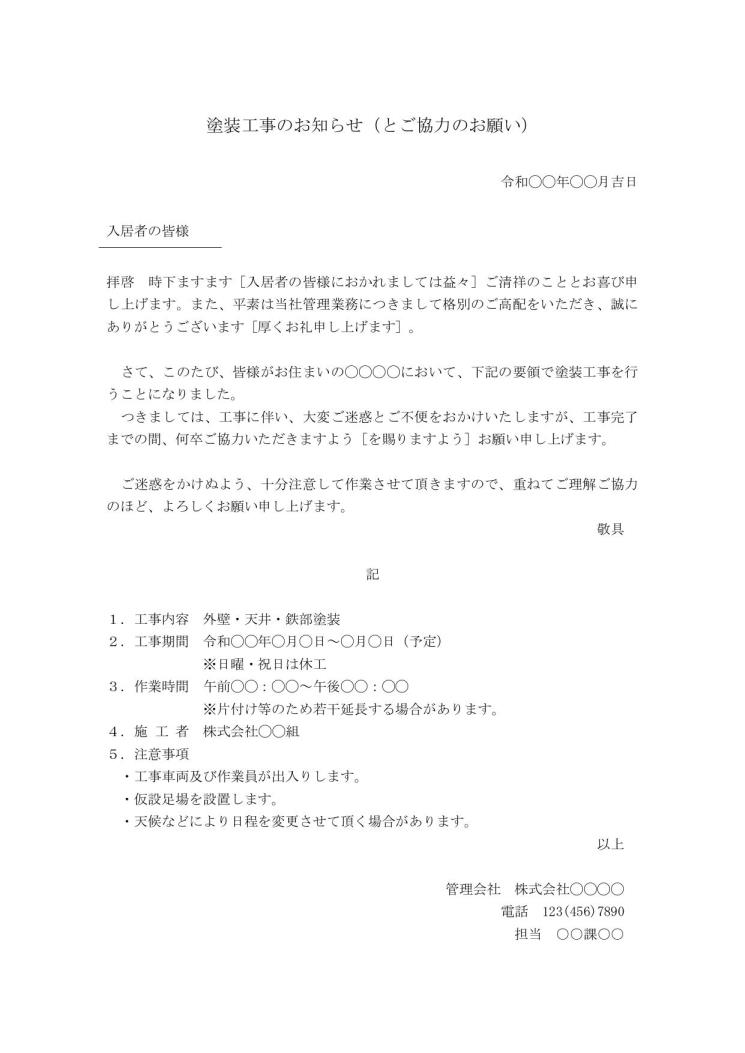 文書 テンプレートの無料ダウンロード: 工事のお知らせ文―塗装工事 手紙形式丁寧。
