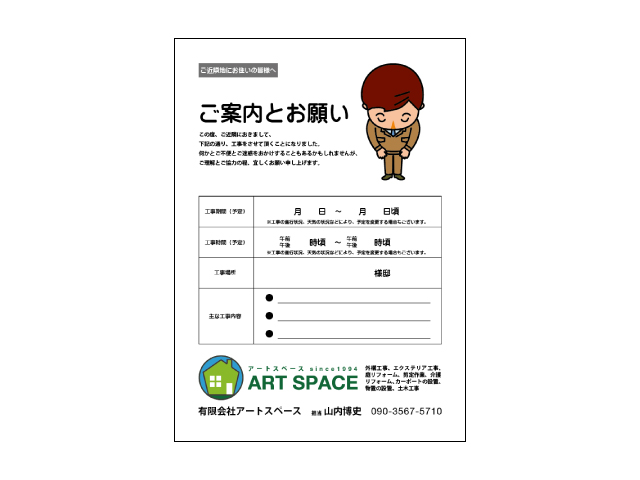 工事案内文 近隣挨拶 Excel 無料テンプレート「00001」は近隣のマンション・学校・住宅への挨拶に便利な雛形。