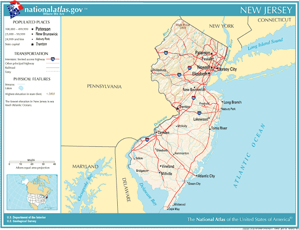 アメリカ合衆国:ニュージャージー州と周辺の州の地図 - 旅行のとも、ZenTech。