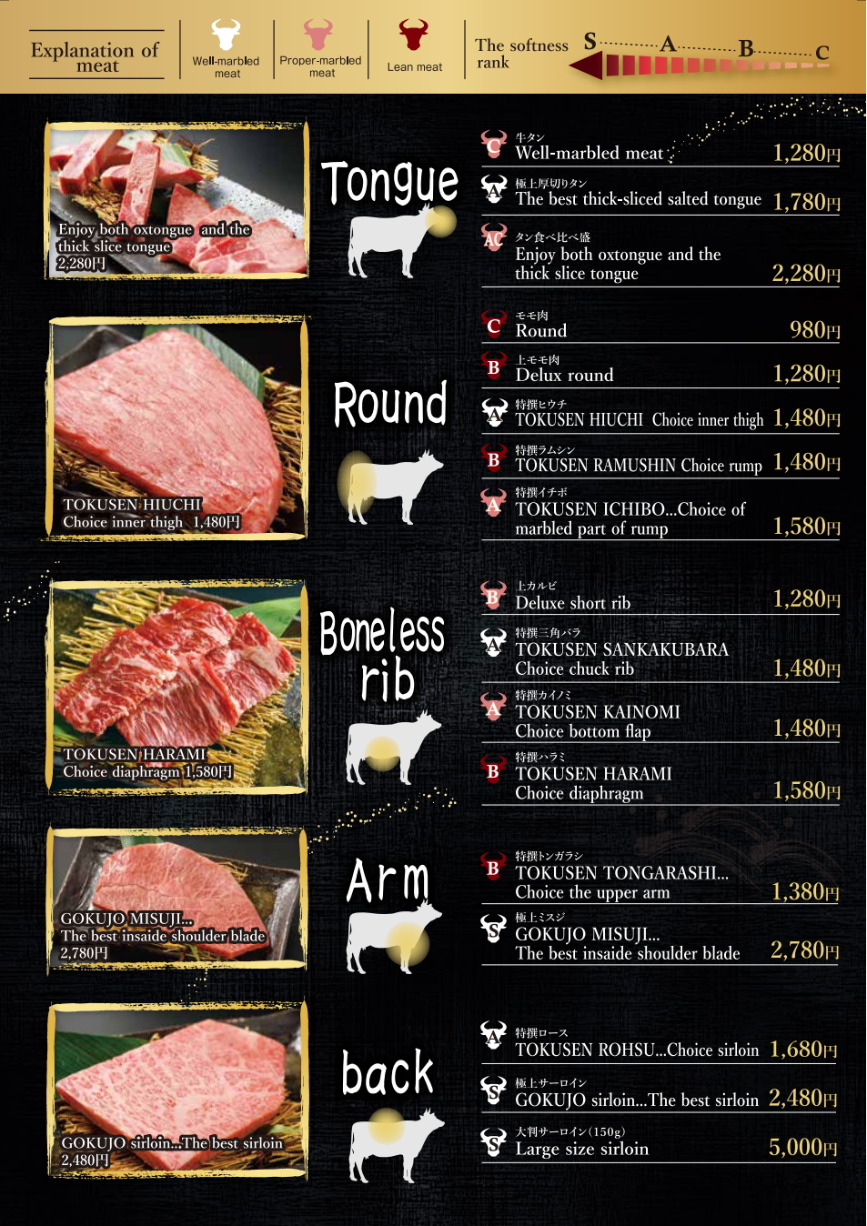 焼肉 英語版メニュー English Menu «焼肉メニュー小倉駅近郊「卸直営焼肉屋 肉処 天穂 てんすい 」。
