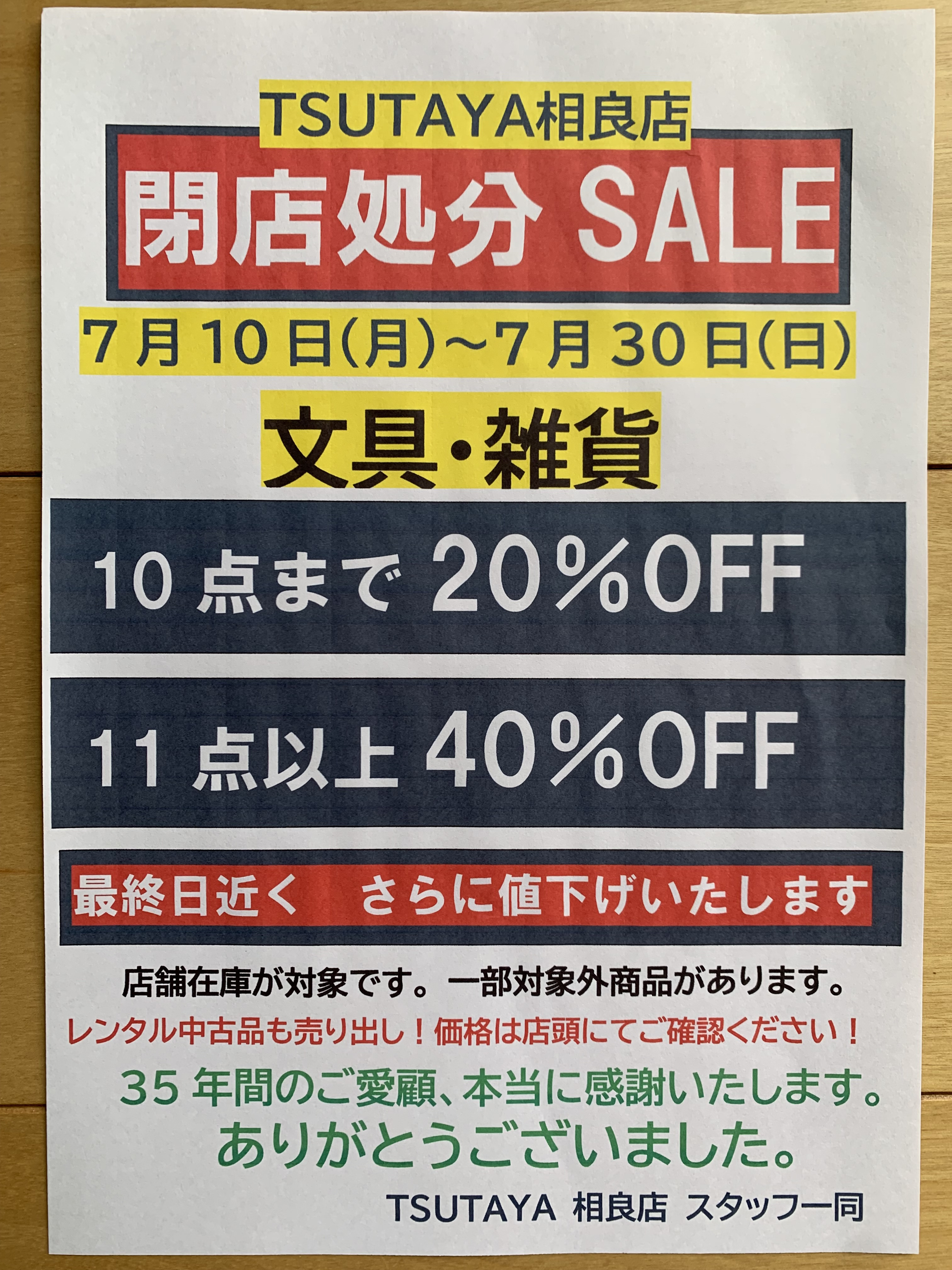 TSUTAYA 相良店 閉店セールのお知らせ - 本と文具 布施書店。